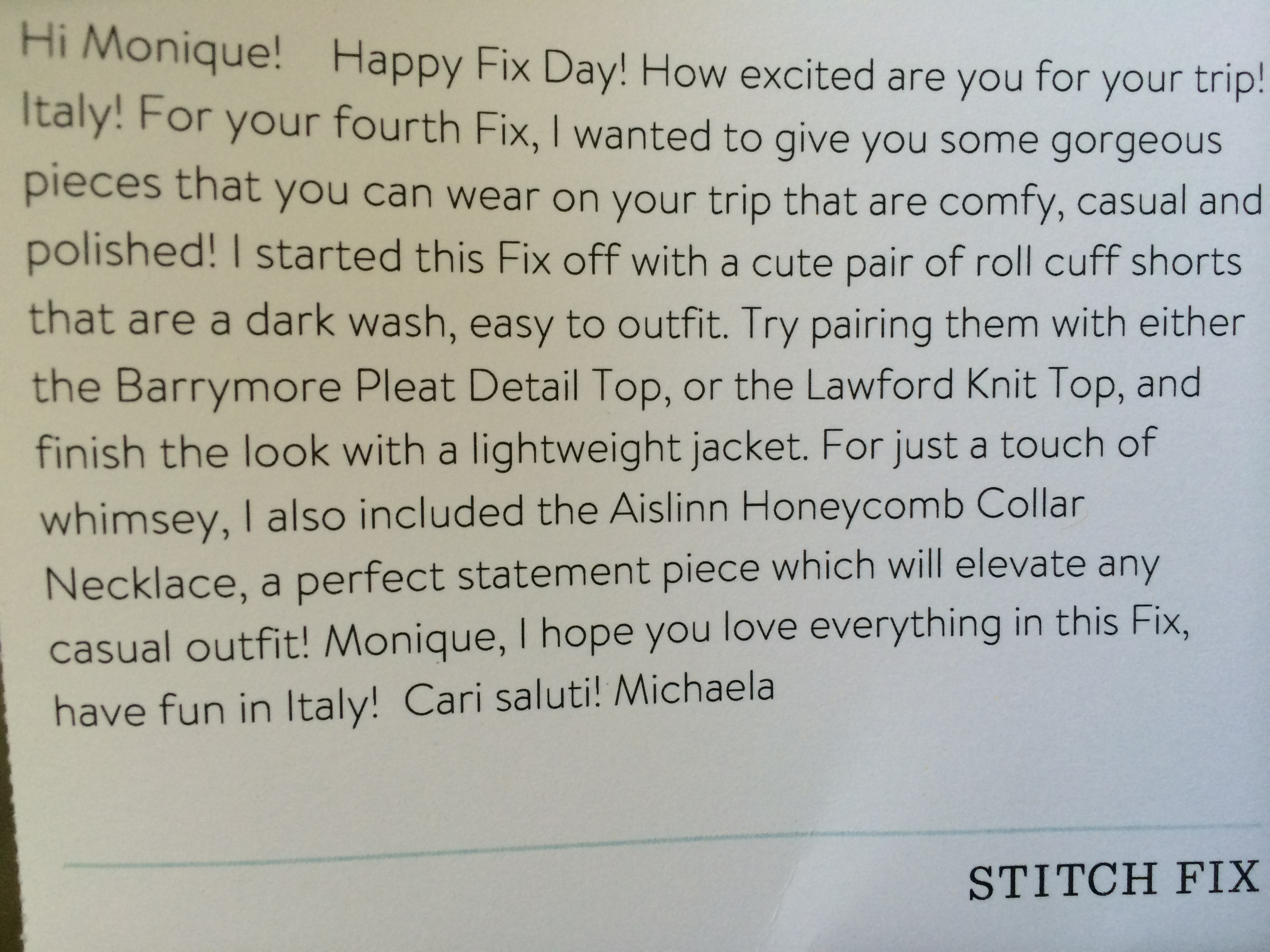 So, 2 out of 5 isn’t too bad, and is definitely better on the wallet! I can’t wait to wear my new clothes in Italy. Oh, and one of my other favorite things about Stitch Fix is the personalized note from the stylist: