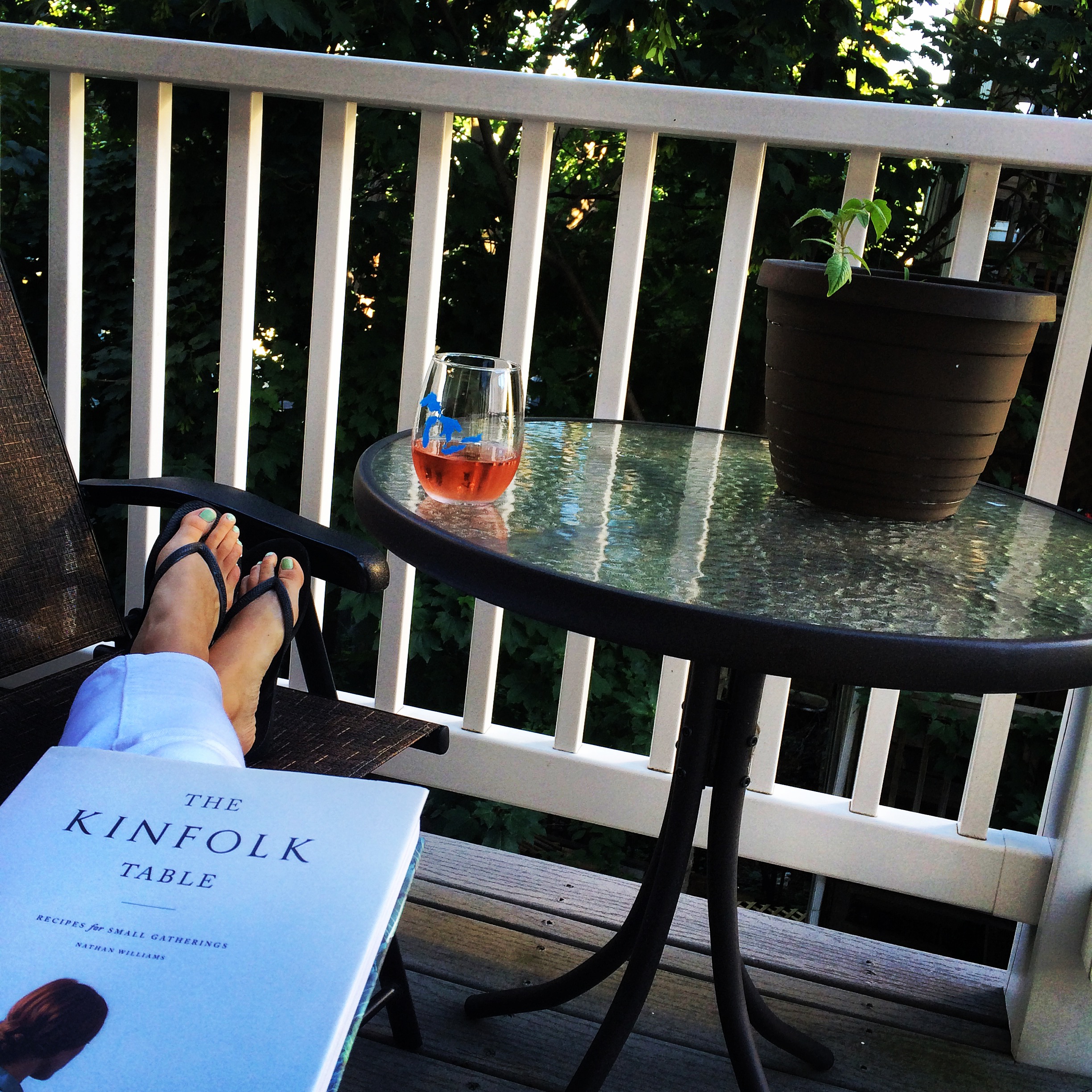 Once I got home, I poured myself a glass of vino (rose- my fav these days!) and headed out to the back deck to enjoy my little urban oasis. My friend Jess got me this cookbook/entertainment book for my birthday and I’m loving it so far!
