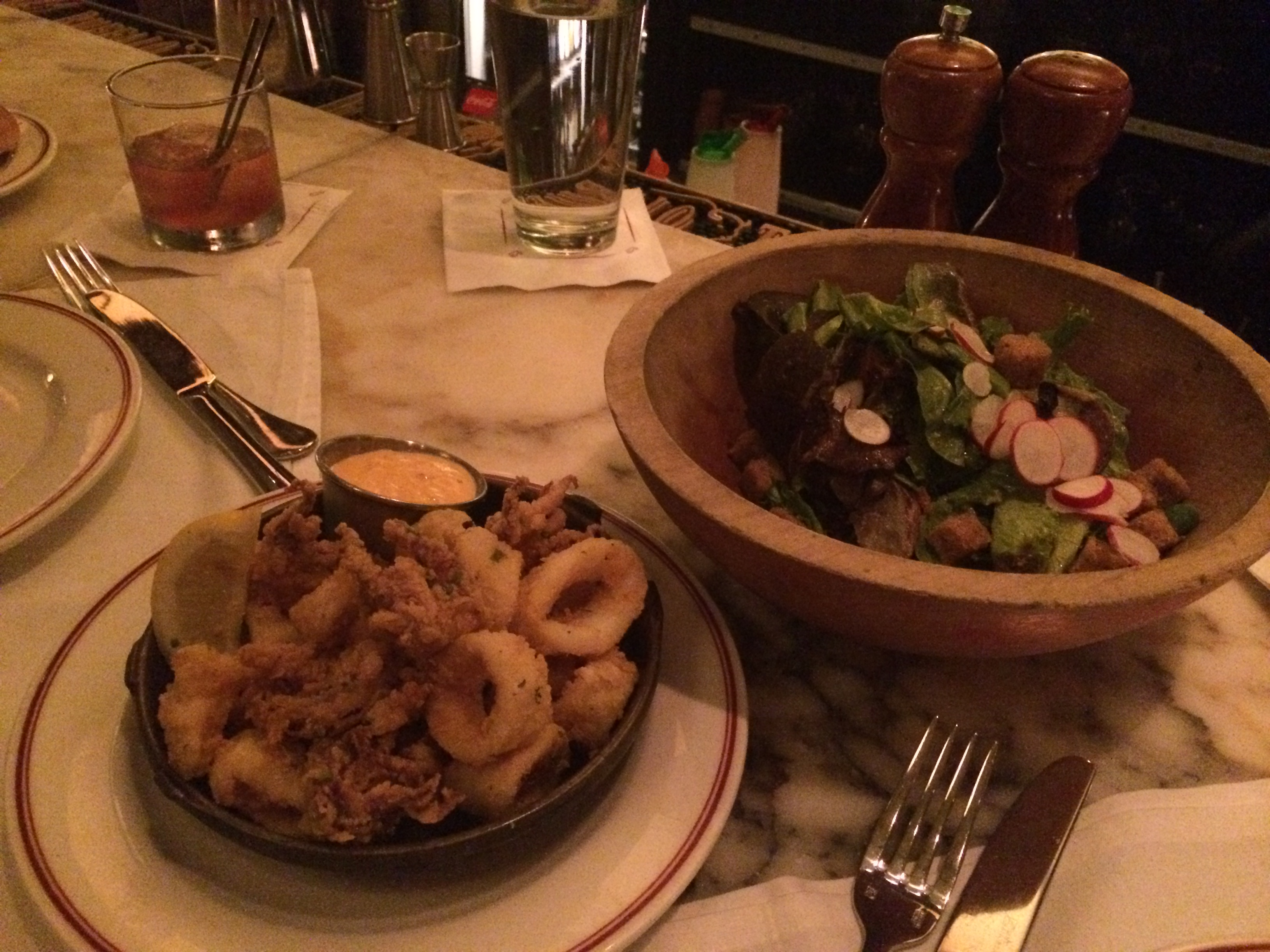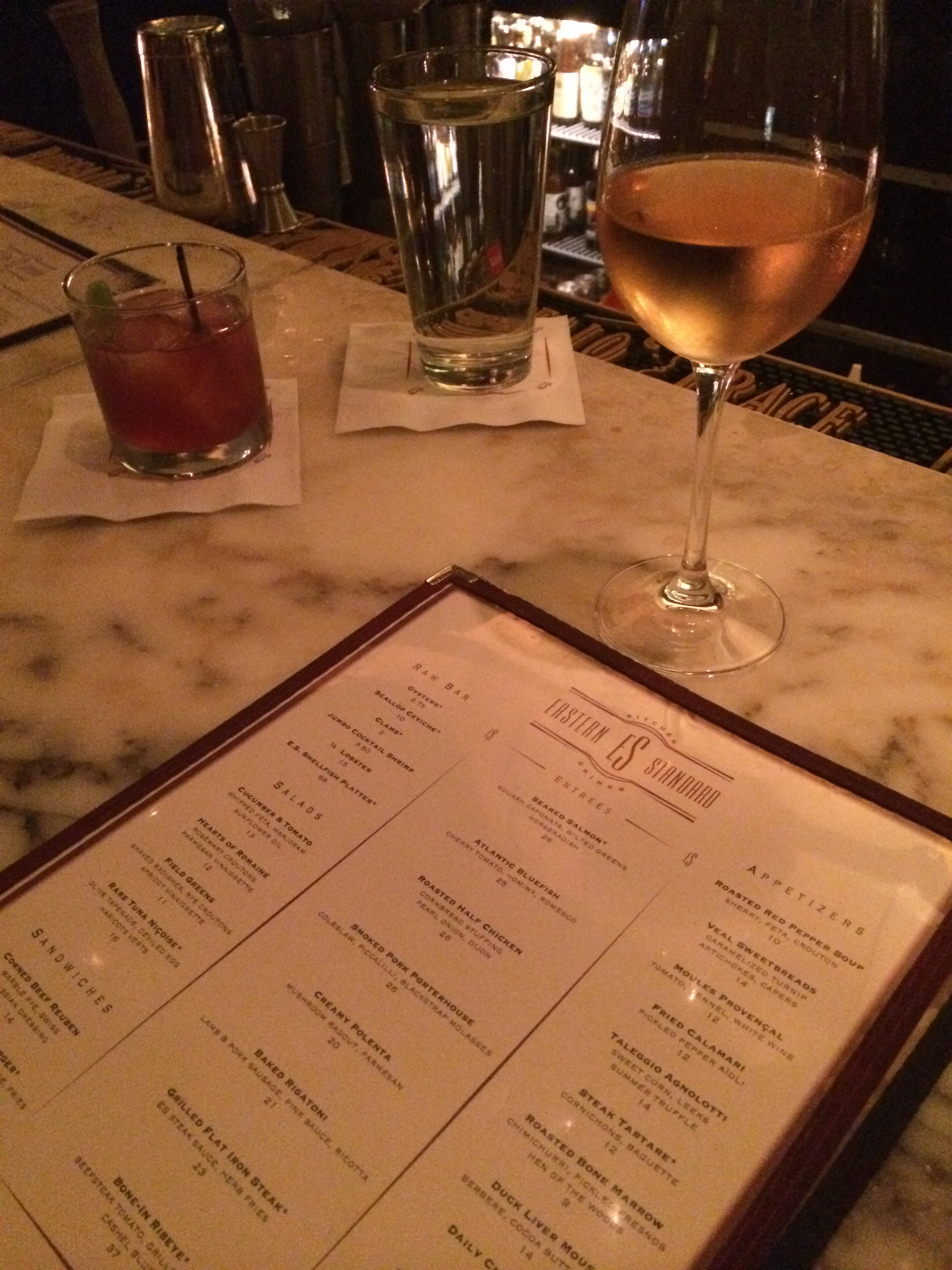 We went to Island Creek Oyster Bar first and enjoyed some drinks and oysters, but ultimately decided we were in the mood for Eastern Standard. It was incredible- even at the prime time in Boston on a Saturday night we found seats at the bar right away at both places. It’s like they were waiting for us 😉 At ES we shared a salad, fried calamari and a lamb sausage pasta bake.