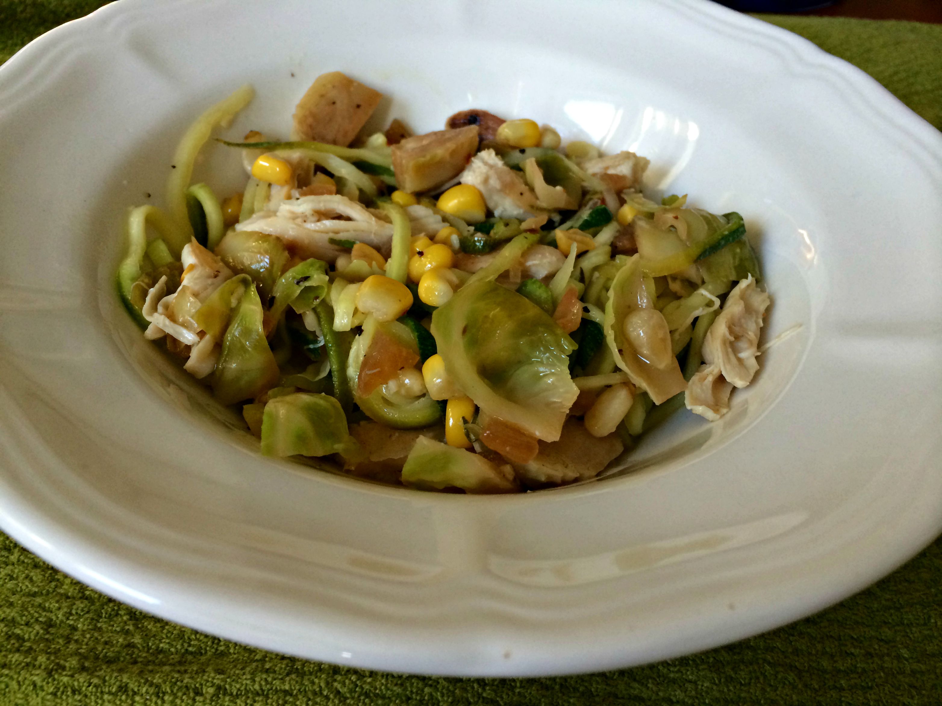 - Once it’s simmerd a bit, add in the steamed Brussels sprouts and let them cook for a bit. Once they are mostly soft, add in the pine nuts and corn and raw zucchini. While that is cooking, heat up another skillet and cook the chicken.