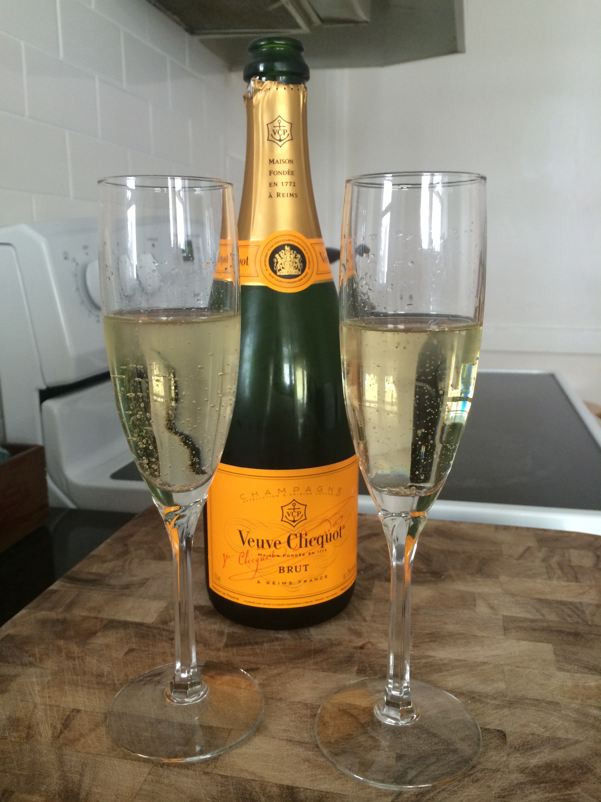 After a drink, we decided to go back to our place and pop a bottle of Veuve that we had had in the fridge for a longgg time.