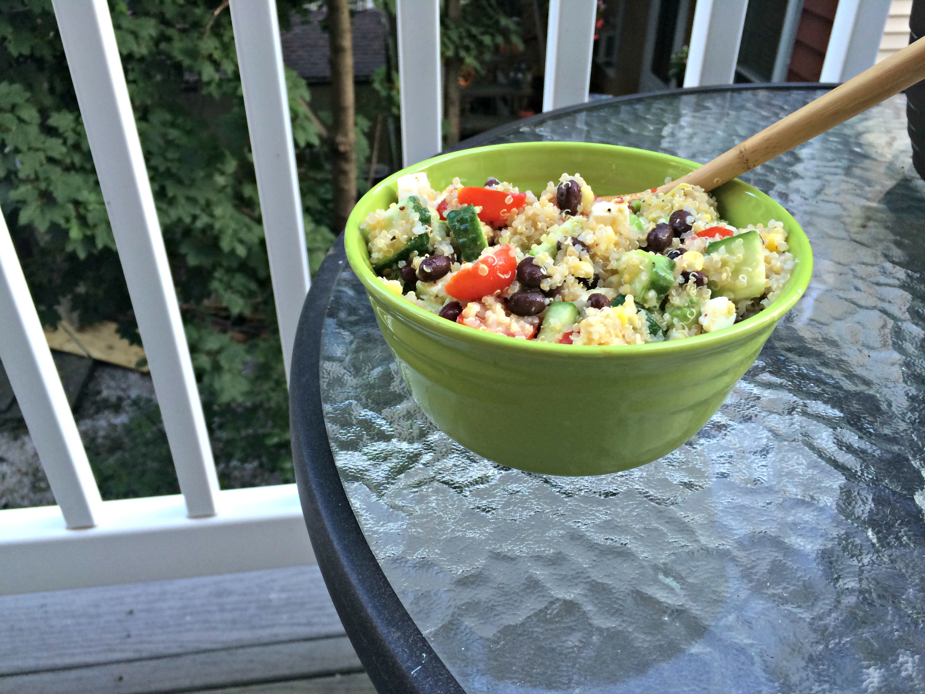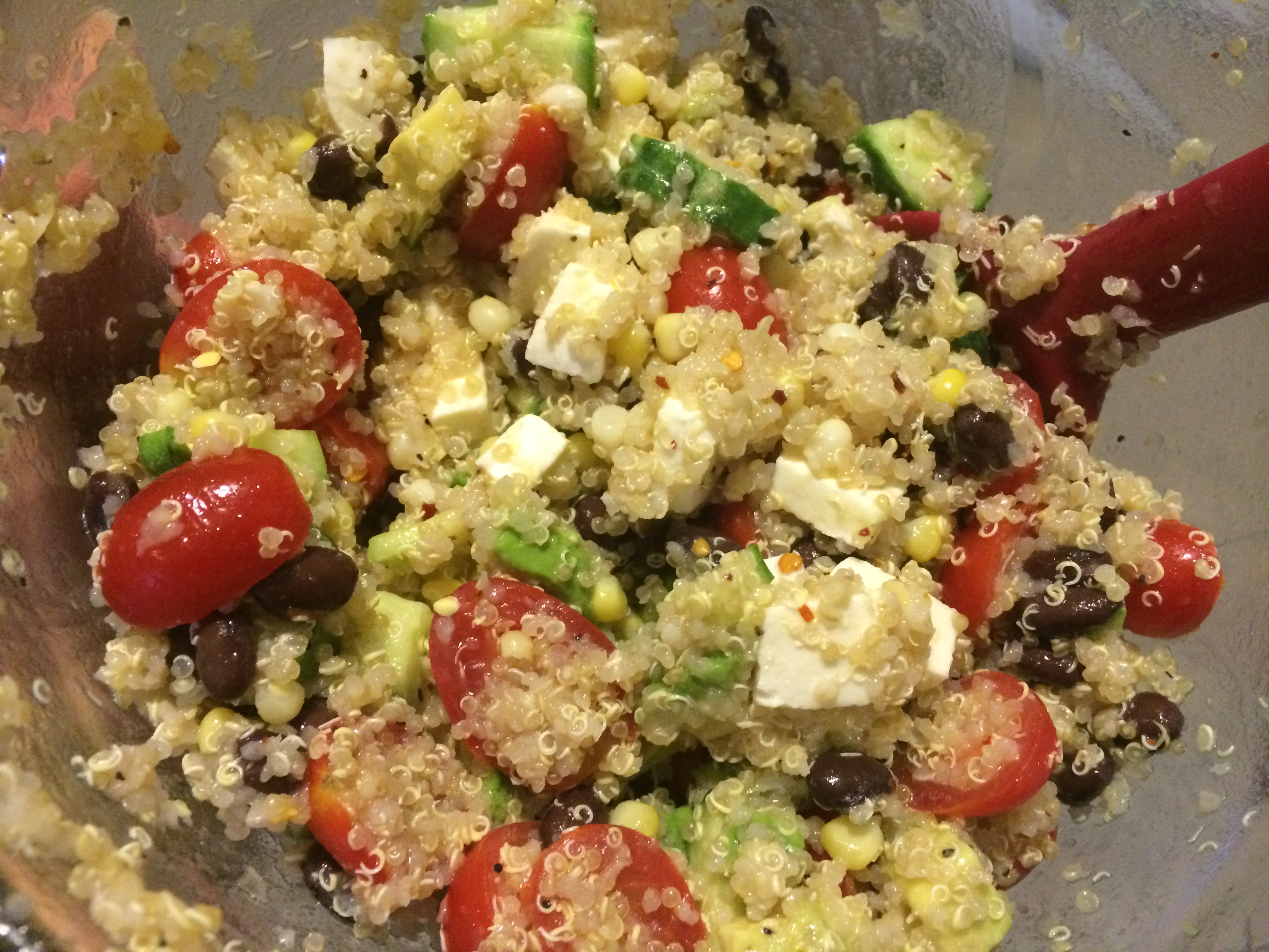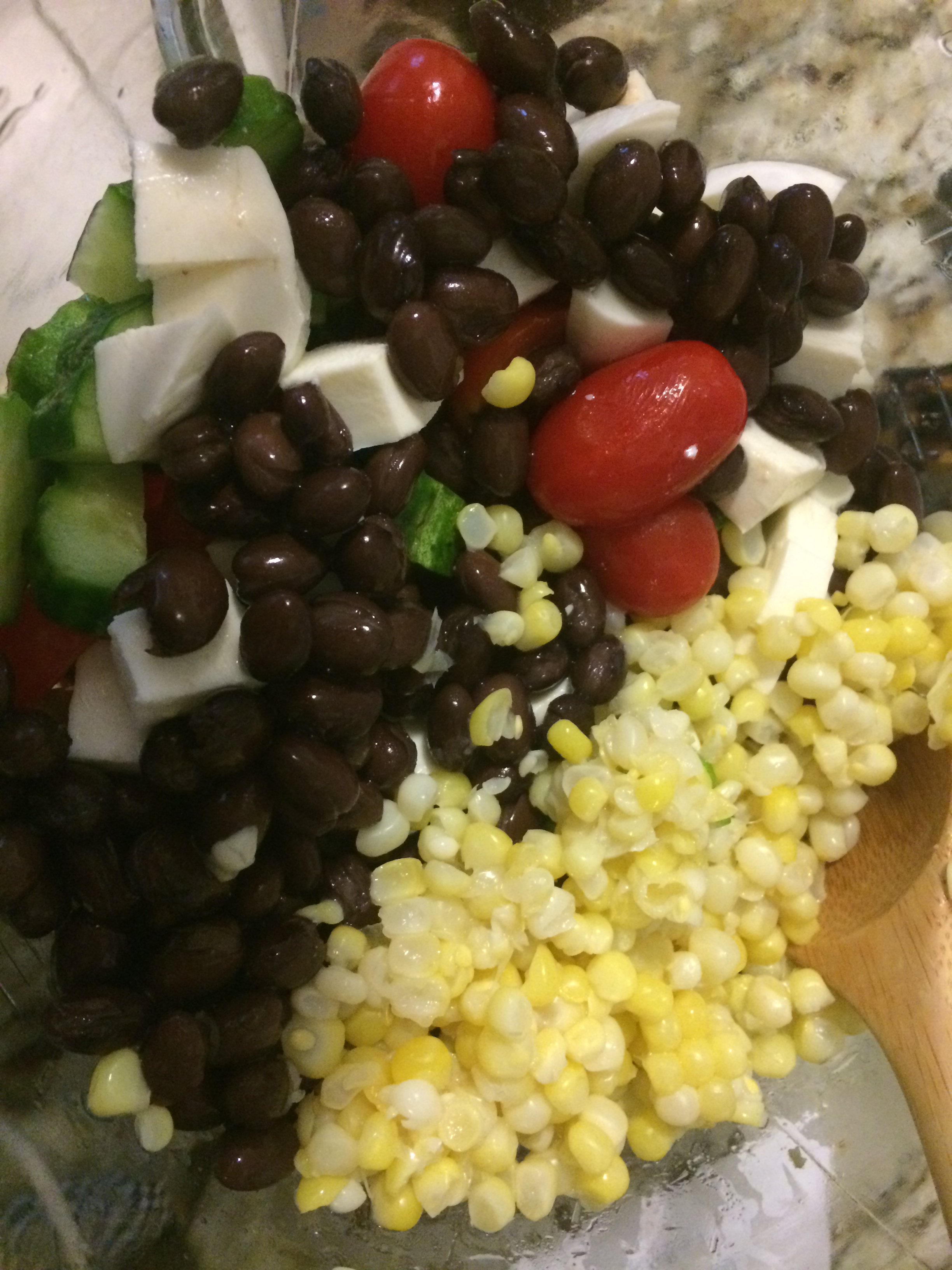 1. Cook quinoa according to the package and steam the corn. Chop up the veggies & cheese and drain the beans and add to a big bowl.