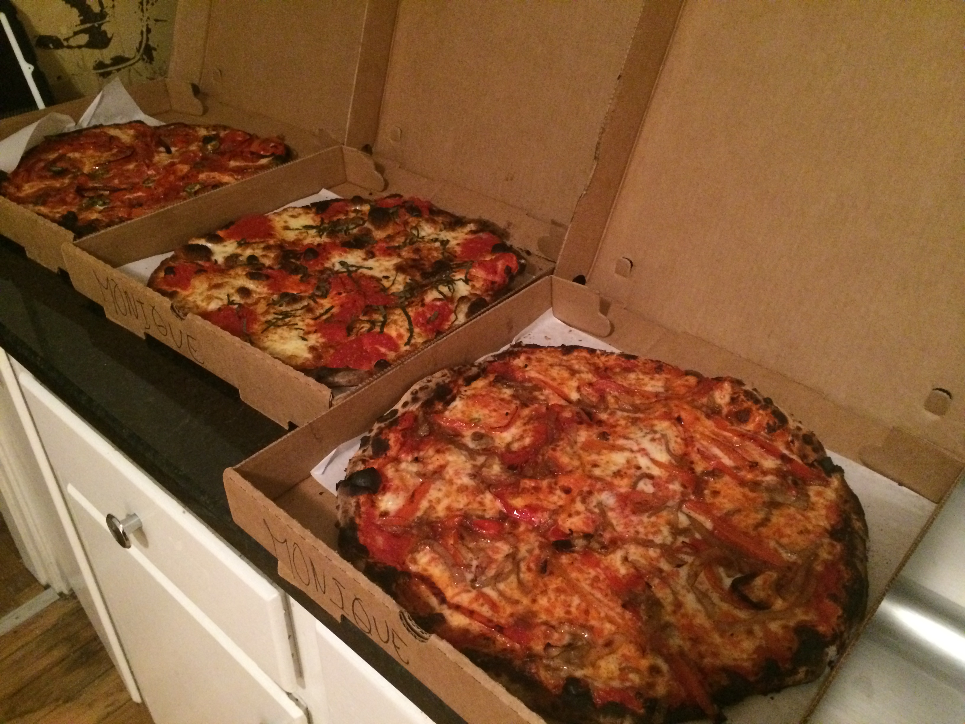Our weekend was a mix of unpacking/organizing/renovating, but we did get together with family which is always nice. Friday afternoon my friend Jessi was in the area so she stopped by for some Prosecco. Later, RM’s brother, sister in law and nephew came over for pizza and vino. We got the pizza from Max & Leo’s, which is just a short walk from our apartment. I have to say, East Boston has pretty much nailed the pizza game, but Max & Leo’s may have them beat! This pizza was outstanding!