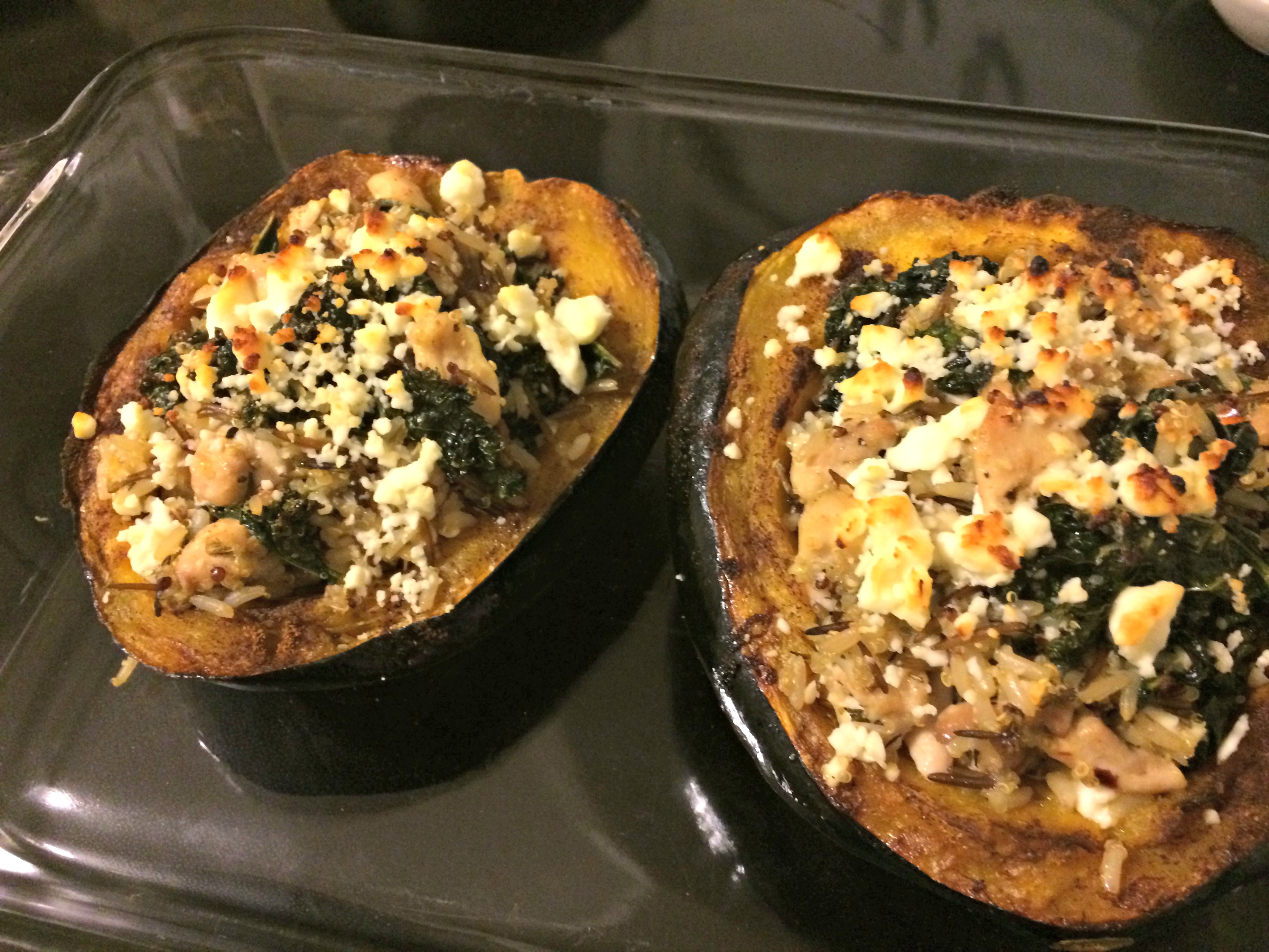 - At this point, everything should be cooked and it’s time to assemble everything. I combined the kale, quinoa and chicken in a small bowl and then stuffed the acorn squash halves with that mixture. Finally, I topped each stuffed half with a sprinkling of goat cheese and broiled for a few minutes until the cheese started to brown.