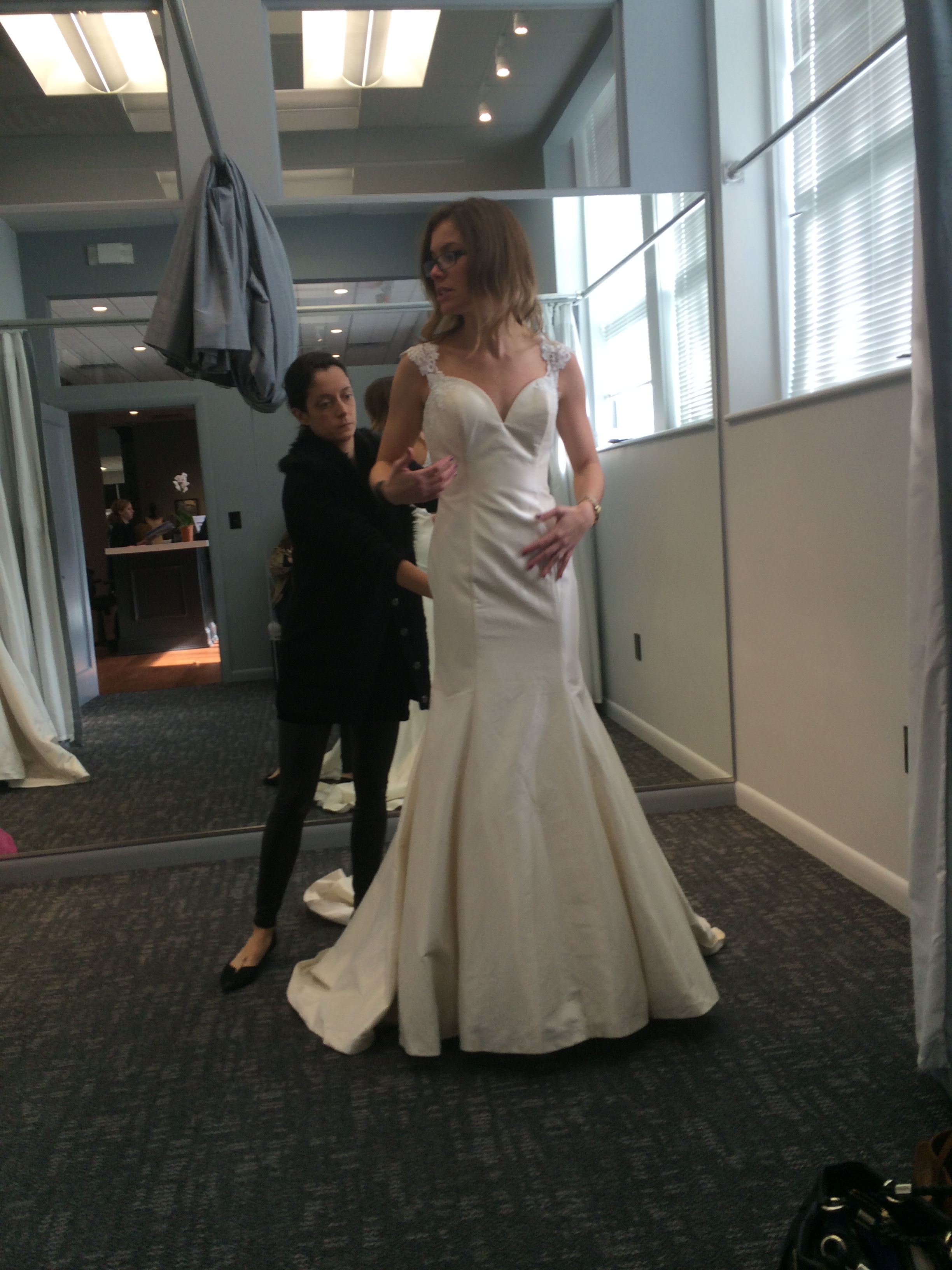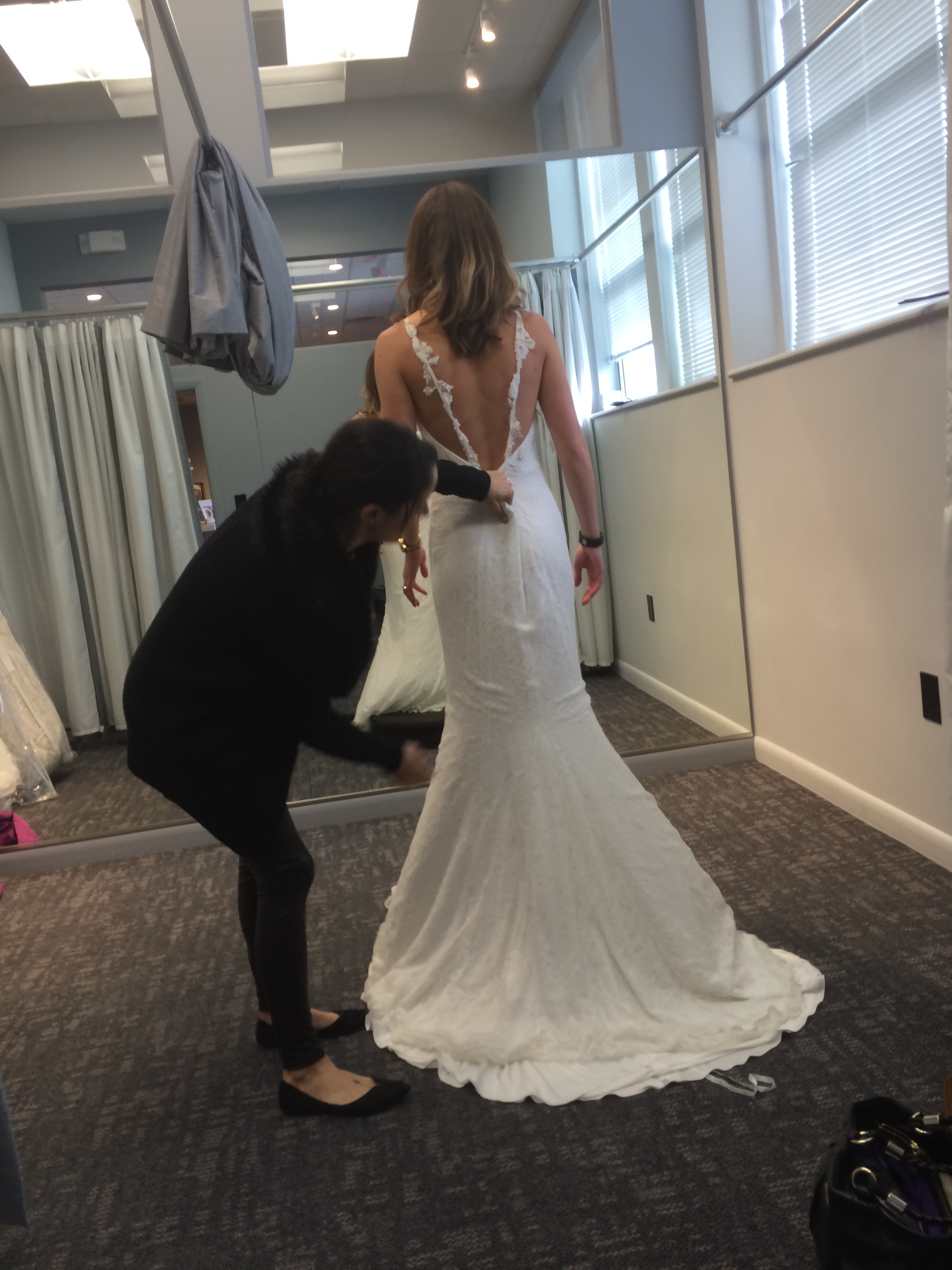 My bridal consultant, Kristen, was absolutely fantastic. She listened to what I wanted (simple, not a lot of poof, low back, not a lot of lace, no sparkles, etc.) and grabbed a great selection of dresses for me to try on. She even set us up in a private room so that my whole family could be together (guys aren’t allowed in the normal fitting room area). I also loved that she was very professional- she didn’t give her opinion that would sway me one way or the other and she offered up lots of interesting tid bits of information regarding the style and designer of the dresses. I never once felt like she was just trying to make a sale.
