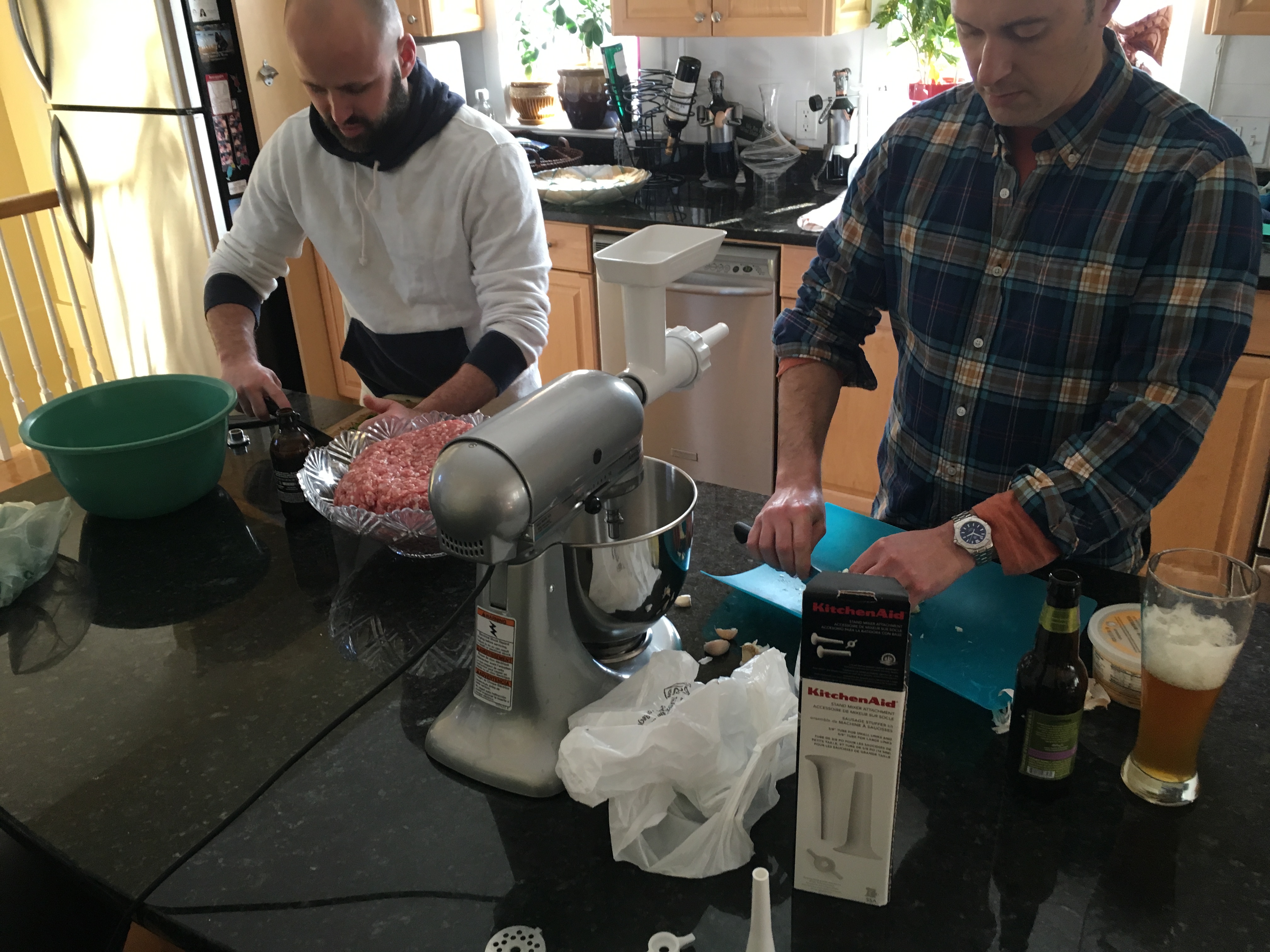 We opted for 8 pounds of meat which ended up yielding about 35 decent sized sausages. RM also had the butcher grind it and season it (2 ounces of salt per 10 pounds of meat) to help save time. We decided to do 2 different kinds: regular and garlic/parsley/parmesan and I don’t know which one I liked more! The whole event was so smooth and seamless- we were all pleasantly surprised by how easy it was! In just a few hours we had loads of sausages to enjoy.