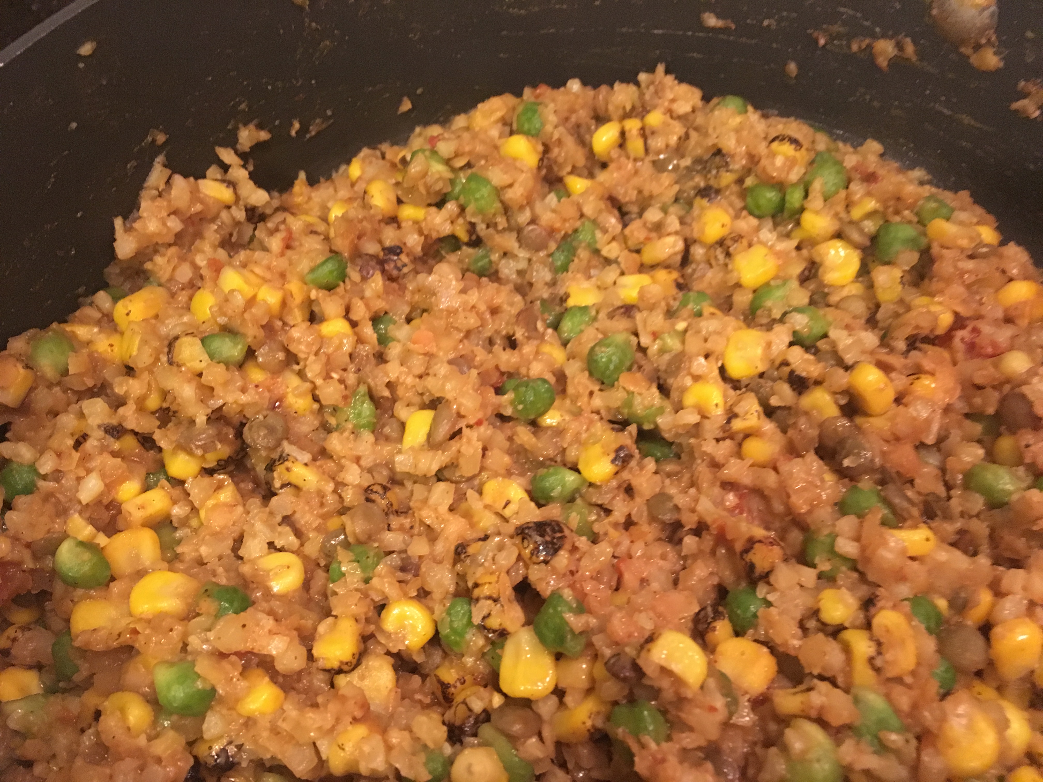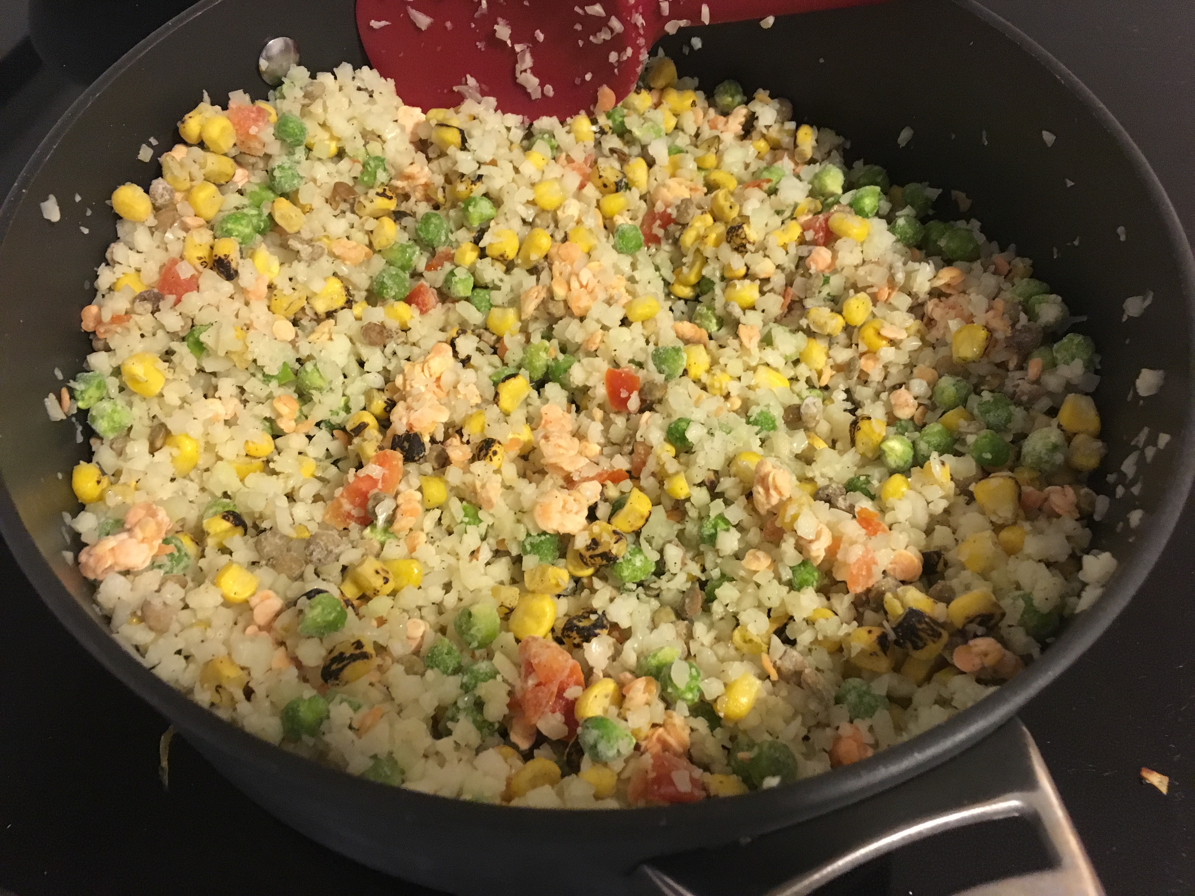 1. In a large pan, heat up a few tablespoons of EVOO. Once the pan is warm, add in the bag of frozen cauliflower rice, 1/2 bag of melodious blend & 1/3 bag of roasted corn. Head until everything is thawed and warm.