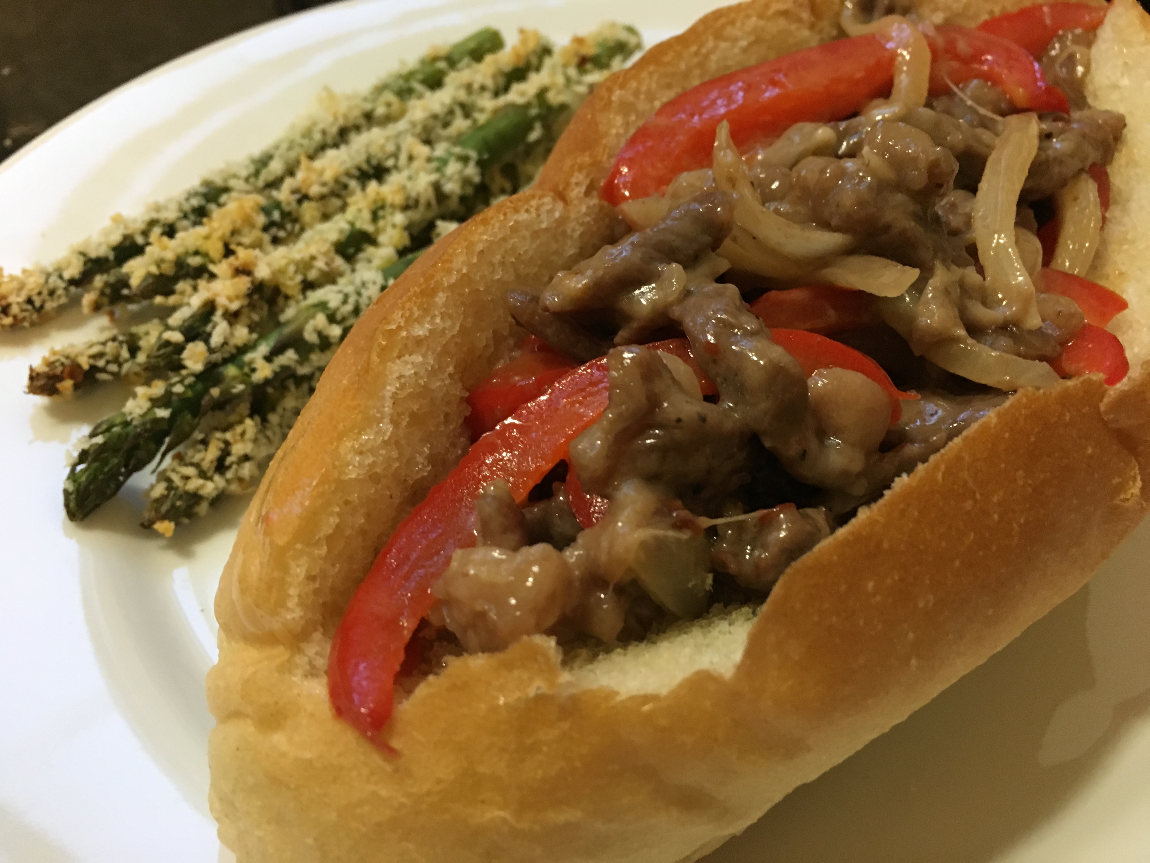 This may have been my favorite meal, but then again, with a cheesy sandwich, how can you really go wrong?! This meal was especially good because it was really quick and easy to throw together when I got home from teaching my Tuesday night double. We were both really impressed with the quality of the meat and I loved the idea of the asparagus “fries”. Thank goodness RM was helping me because I wouldn’t have thought to have added the cheese TO the pan with the steak, peppers and onions, but it was brilliant because everything got coated with the cheesy goodness. So tasty!