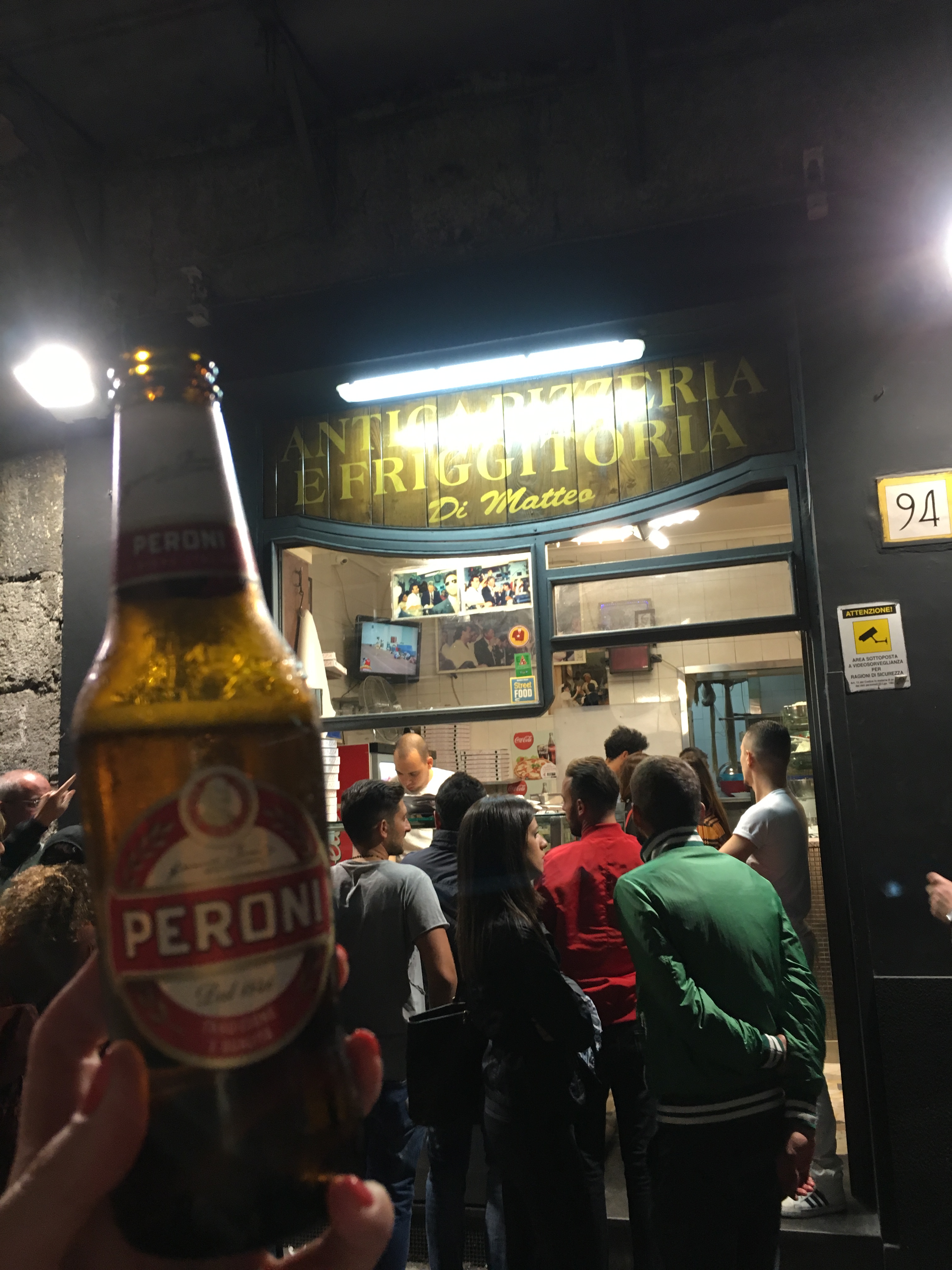 - Pizza at Di Matteo. Tribunali Street is THE street to get pizza if you’re in Naples. If the line at Di Matteo is too long, there are at least a handful of other well-known, delicious places to choose from. We grabbed beers at the store next door, ordered a pizza and found a stoop to eat it on. It was amazing- and the pizza was only 3 euros- heck of a cheap date 😉