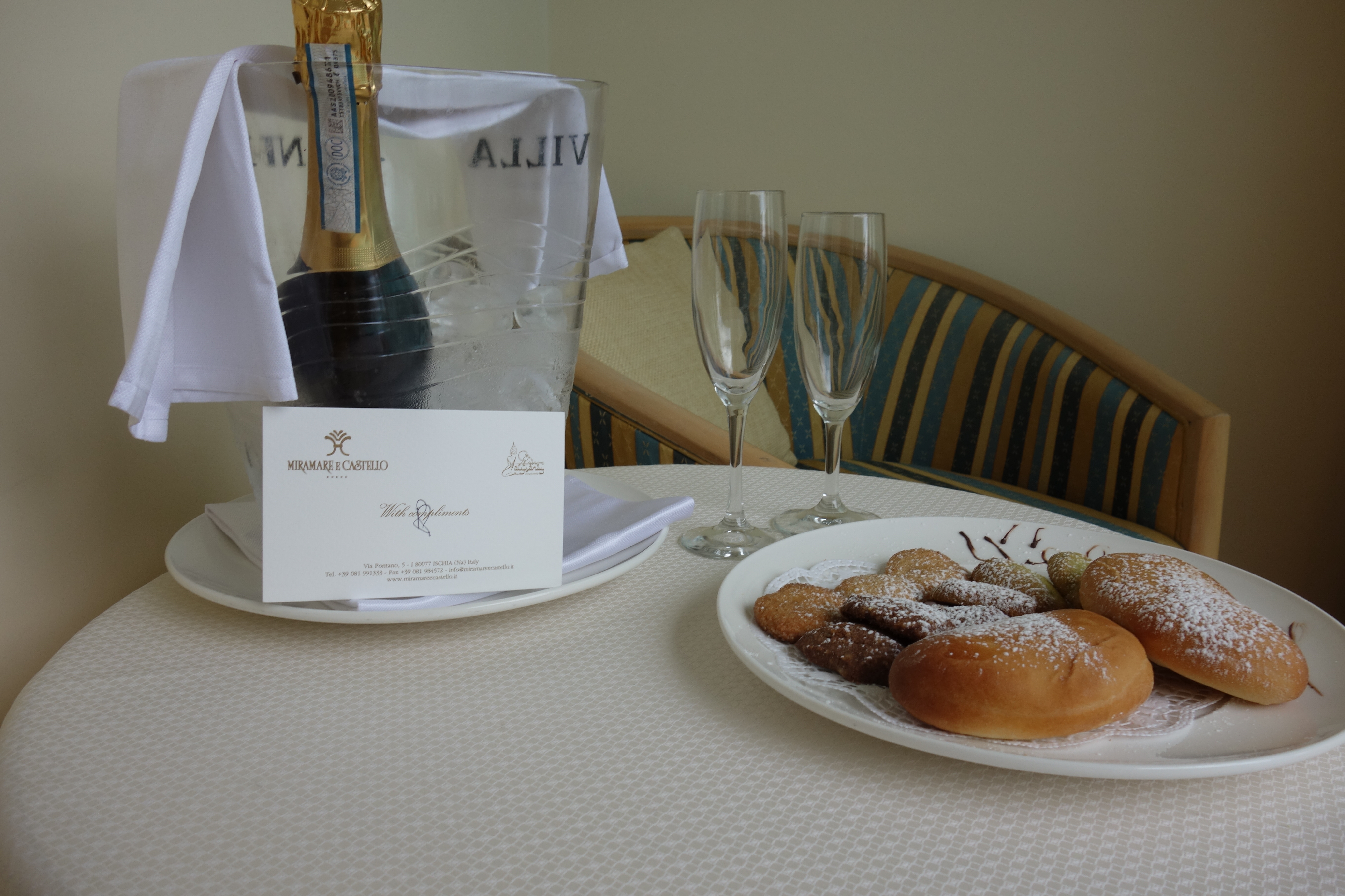 We stayed at the stunningly beautiful Miramare e Castello hotel, which was right on the water so we had a private beach and a private pool- the best of both worlds! Walking into the hotel we were greeted by the warmest front-desk staff, who were always there for whatever we needed. Our room was also wonderful- a nice, big bed, little sitting area and an gorgeous terrace with a day bed overlooking the water, Mount Vesuvius and the castle. They had some bubbly and snacks for us upon arrival as a sweet honeymoon gesture- both things are sure ways into my heart π