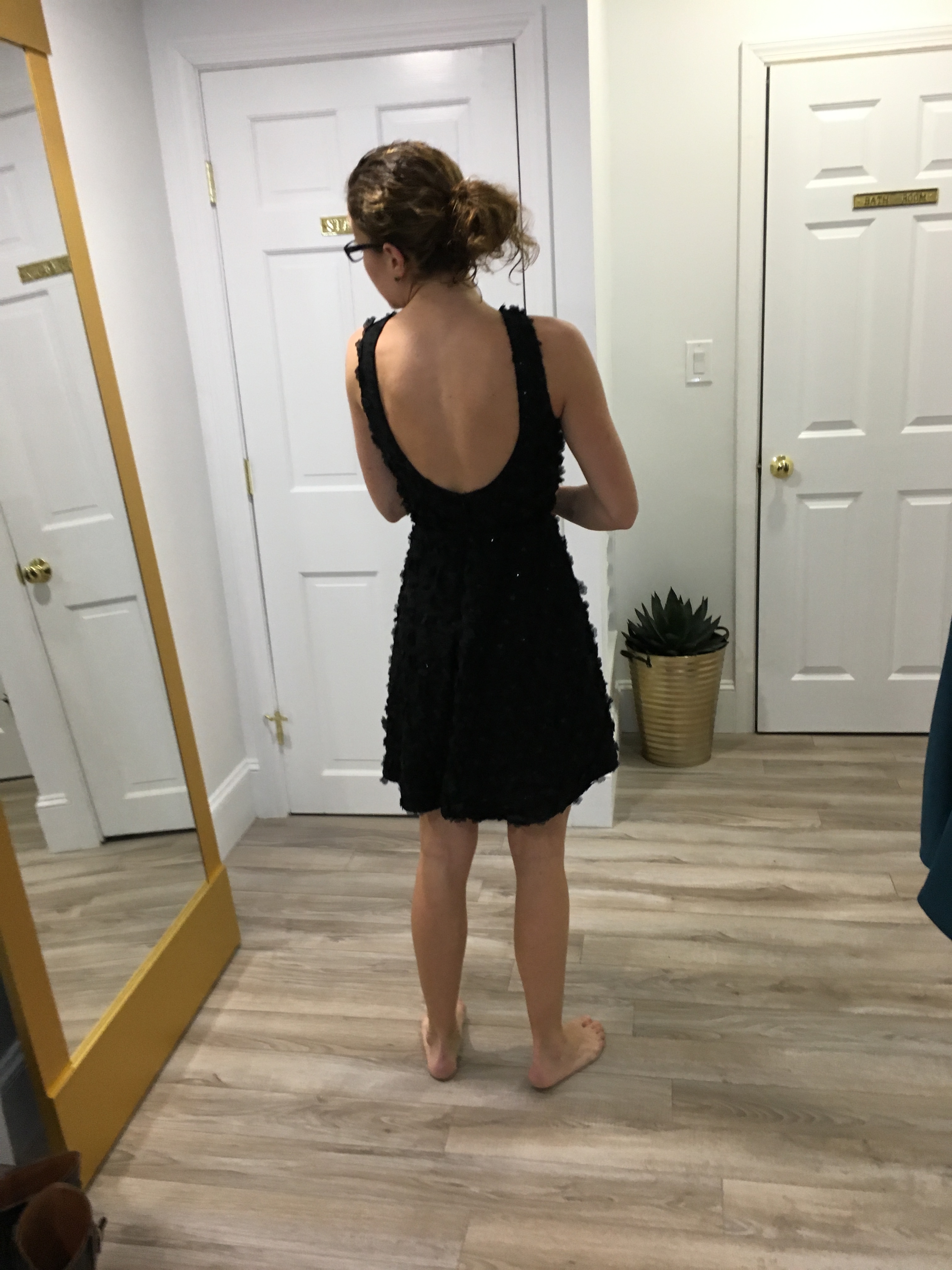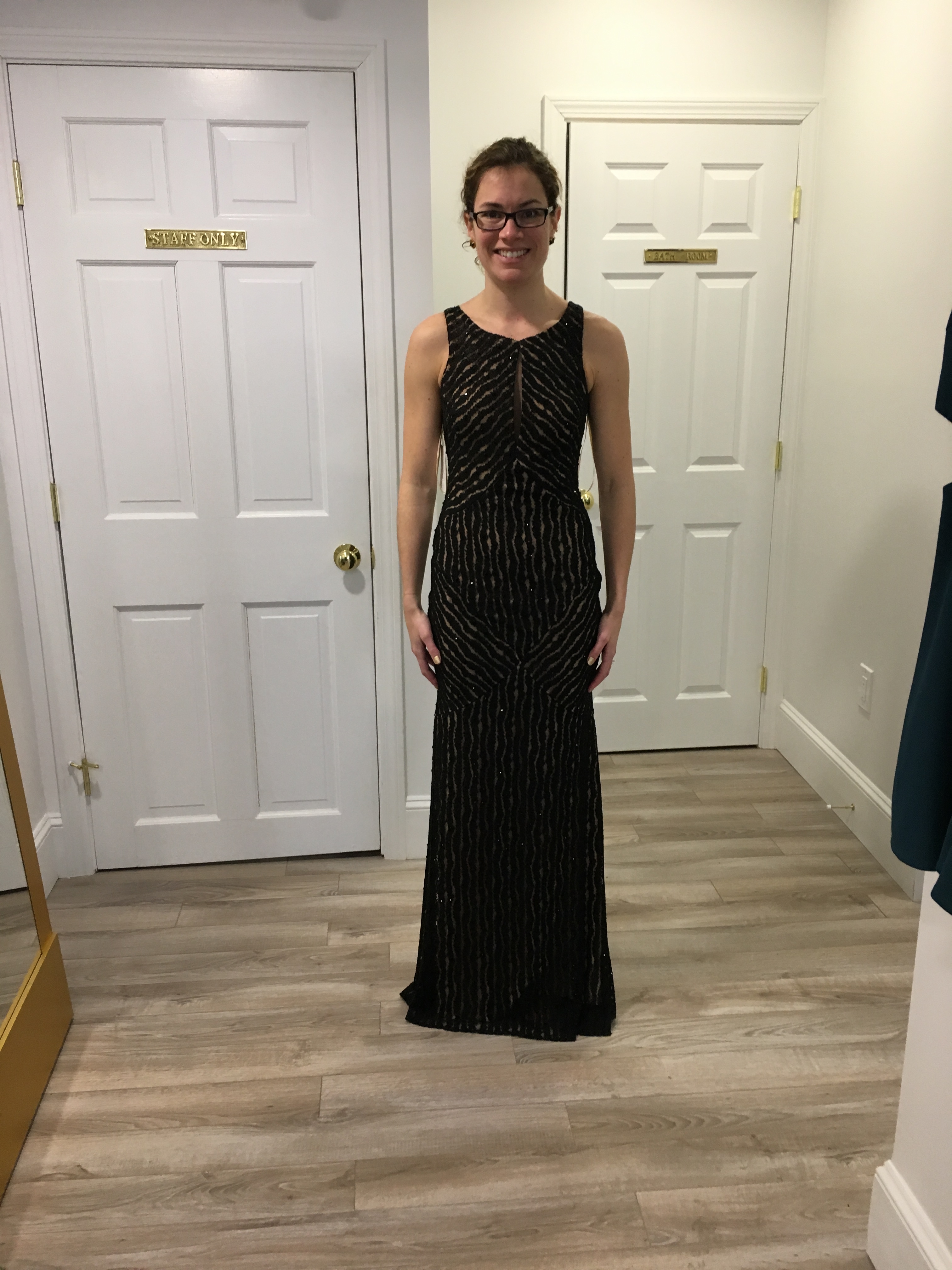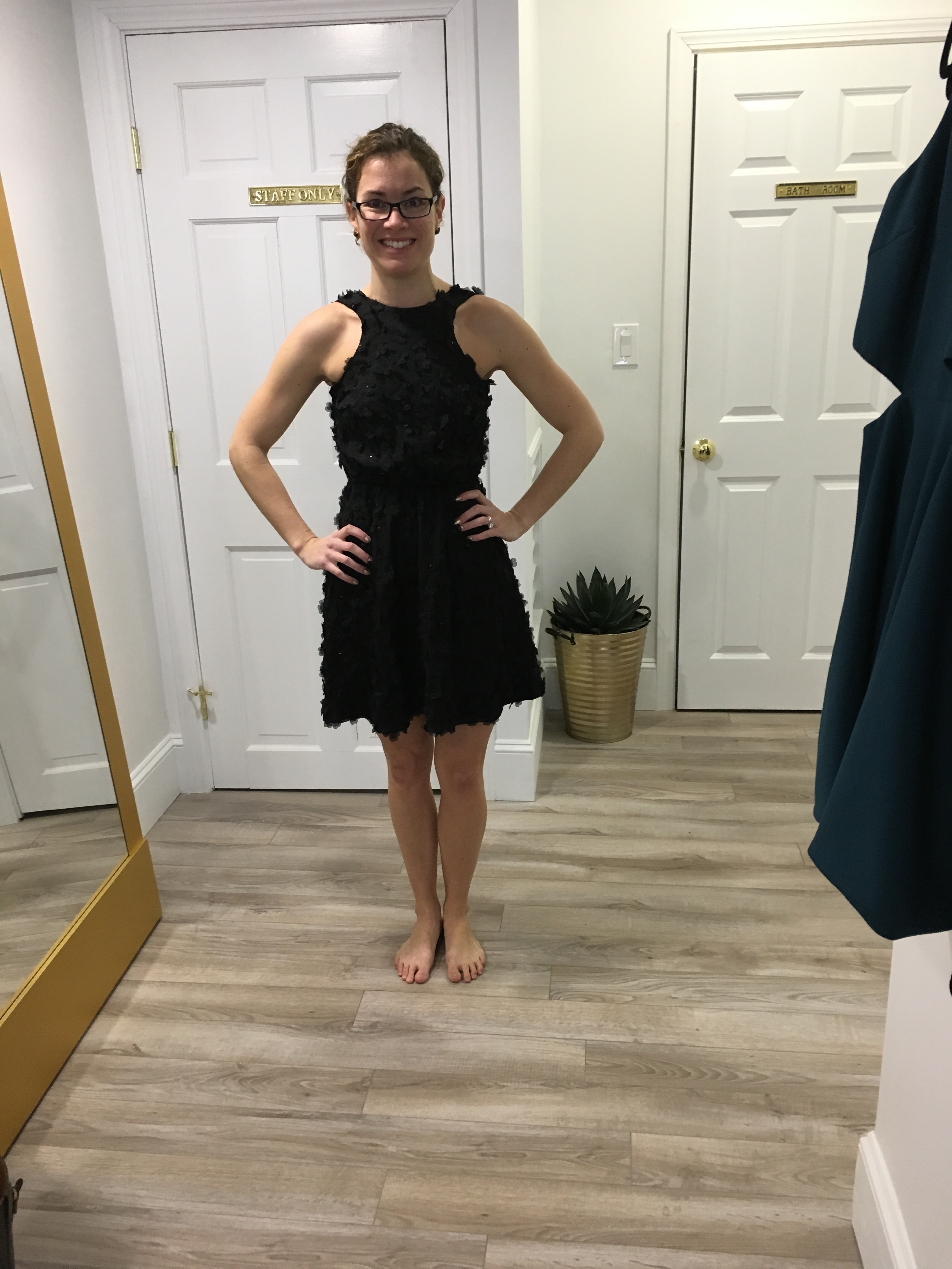 The dress I got for my company party is completely different: it’s knee length with a v-neck and then a mid-back V as well. It’s a goldish type of color with a little ruching, which is always a flattering option. It’s super comfortable and festive because of the gold. I can’t wait to wear it- and maybe I’ll even buy it since they do have the option to buy after you rent 😉