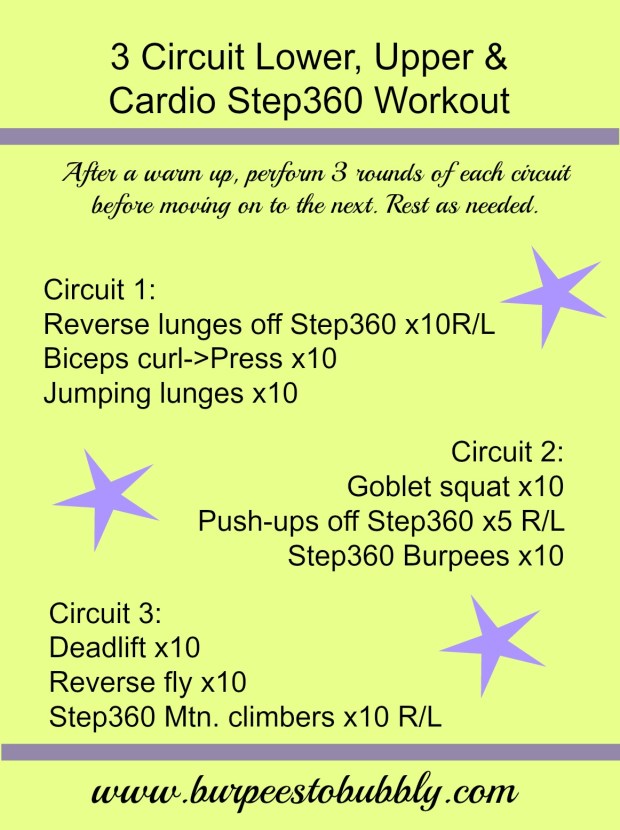 And now, onto the workout. A few weeks ago I shared a Step360 workout with you. I enjoyed that workout so much that when I was thinking of what I wanted to do for a workout on Sunday, I knew I wanted to include it. If you don’t have a Step360, any type of step would work for it and if you don’t have a step of any sort, you can totally do the workout without.