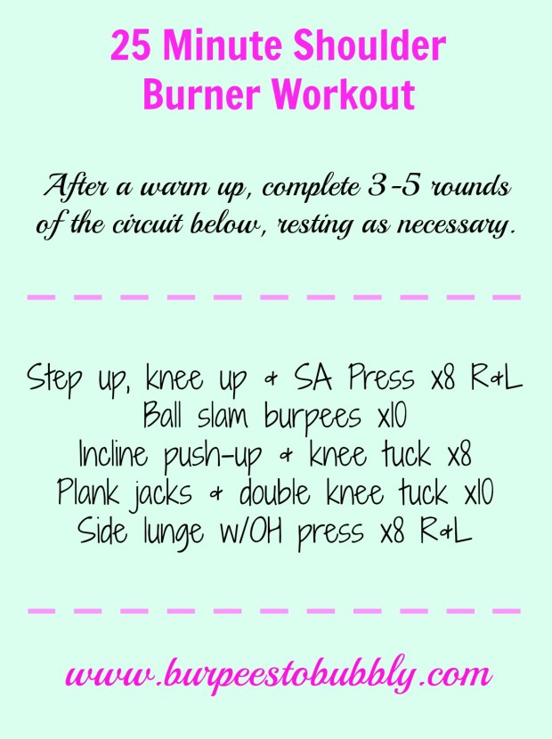On top of it being a shoulder burner, you’ll notice that your core is getting a workout, too- especially the obliques in the single arm OH press since you have to work to not lean away from the weight. I did 5 rounds and it took me a little under 25 minutes- just in case you need an idea of how long it will take you.