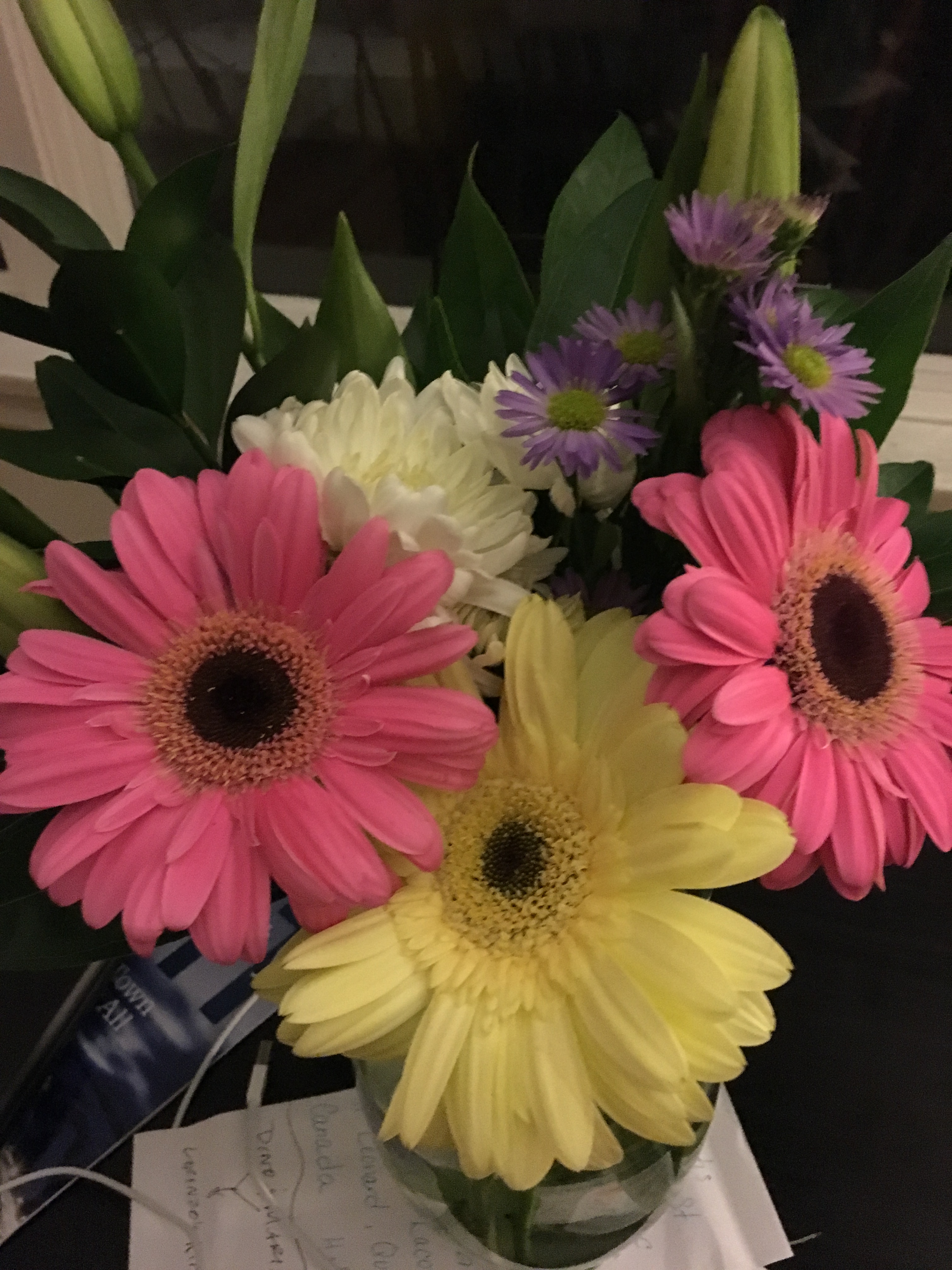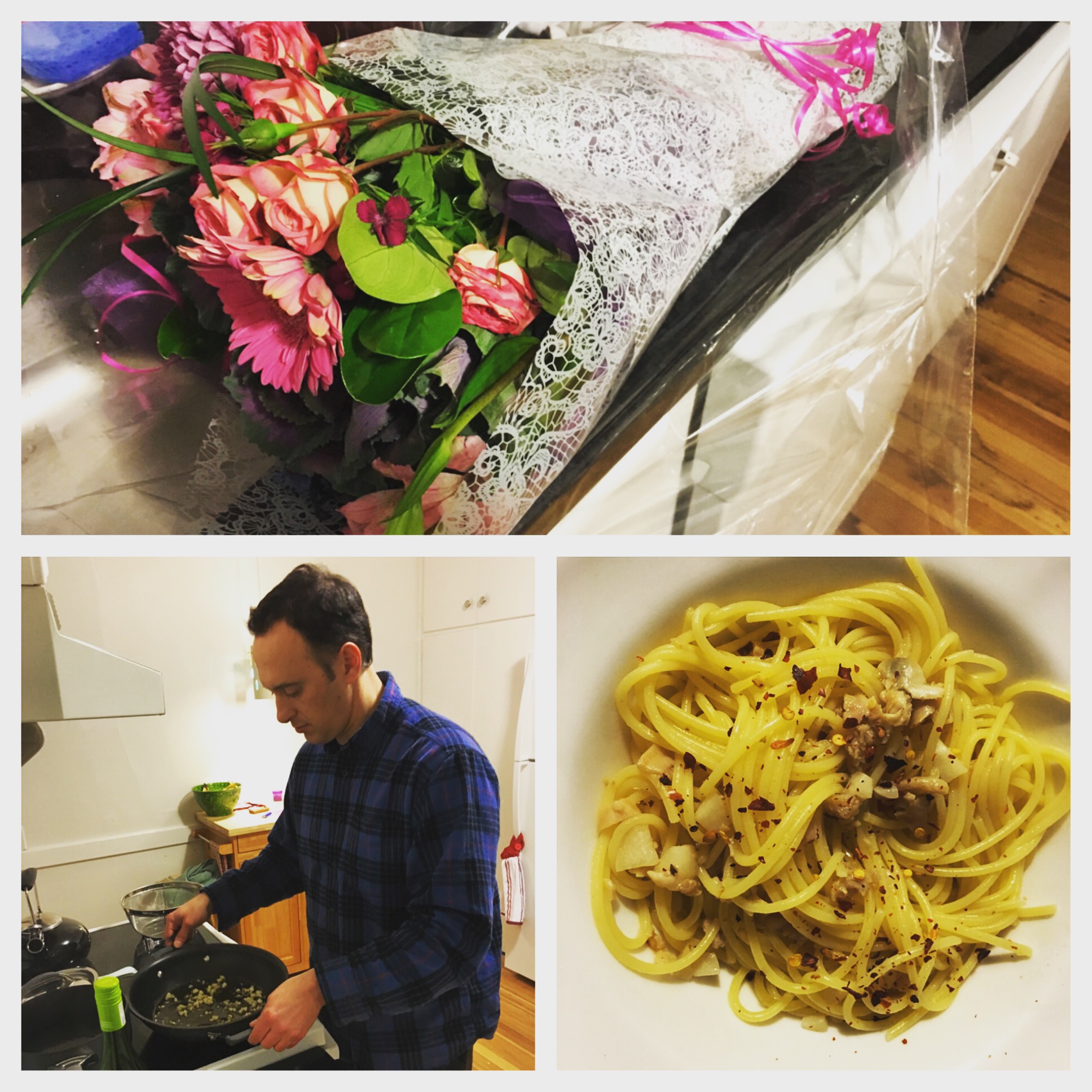 - After work drinks at Tony C’s at Assembly Square with some college girlfriends was a fun treat, but coming home to surprise early Valentine’s Day flowers and a delicious spaghetti with clams dinner was even better!