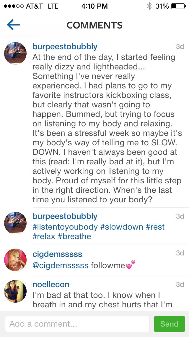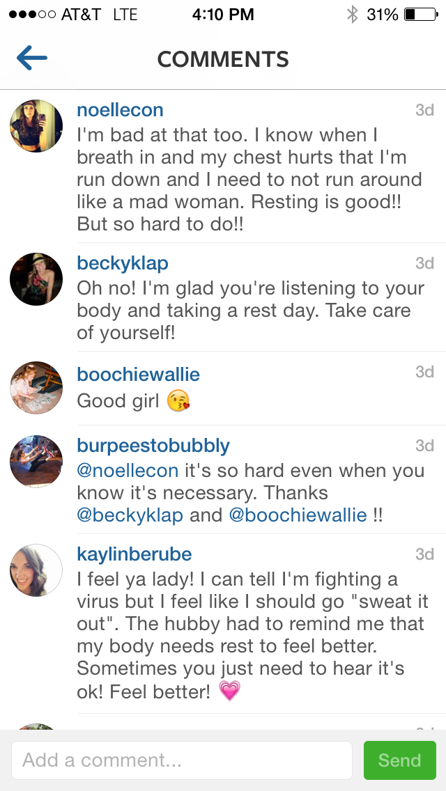 I have never experienced what I experienced last week, but I can tell you it wasn’t very fun. Looking back, it’s likely from pushing myself too hard and too far, but I struggle because if I feel ok and want to work out, how do I know that I’ve pushed it too far until something happens? In the past, I’ve struggled with rest days… more than I’d like to admit. But, over the past few months, I’ve been much better at not only TAKING 2 every week, but also ENJOYING it. I look forward to my rest days now, actually.