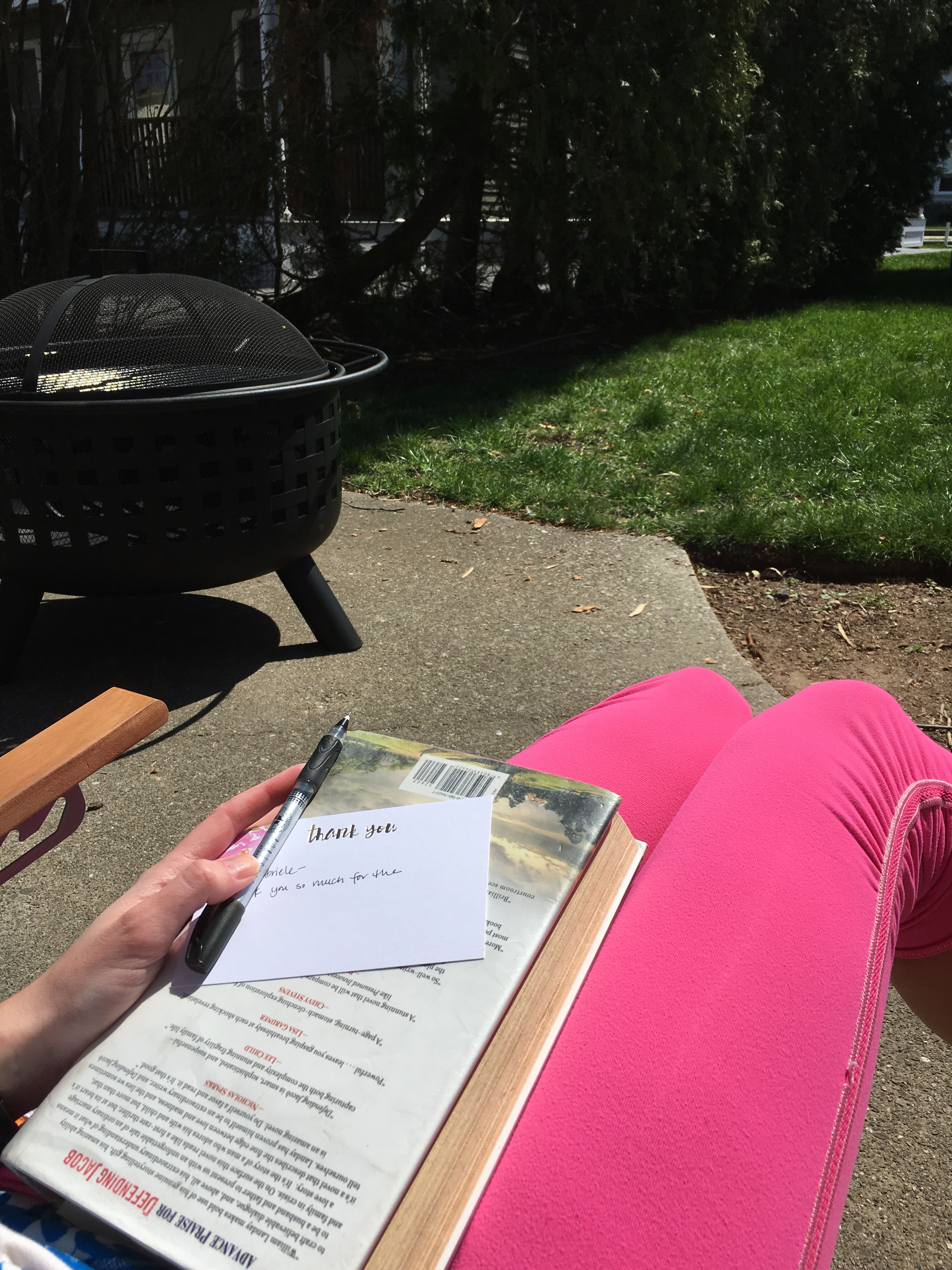 Taking advantage of the sun and doing my thank you cards for the bridal shower gifts we’ve received outside. And then I started reading Defending Jacob, which is our new book club book. So far, I’m enjoying it, although it’s crazy that it takes place in Newton!