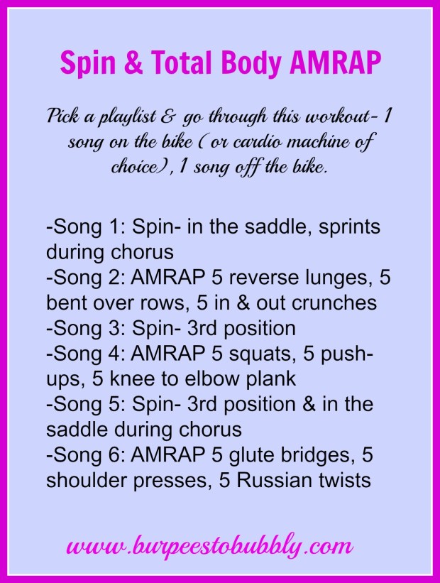 The way the workout works is you’ll do one song on the bike, then you’ll do an AMRAP of the exercises listed above for “off bike” songs for the duration of that song. You’ll need a pair of dumbbells (or two pairs if you want to go heavier/lighter on some exercises). For the spin songs, I’ve also included suggestions in terms of position & resistance if you decide to go with the play list I’m showing you below.