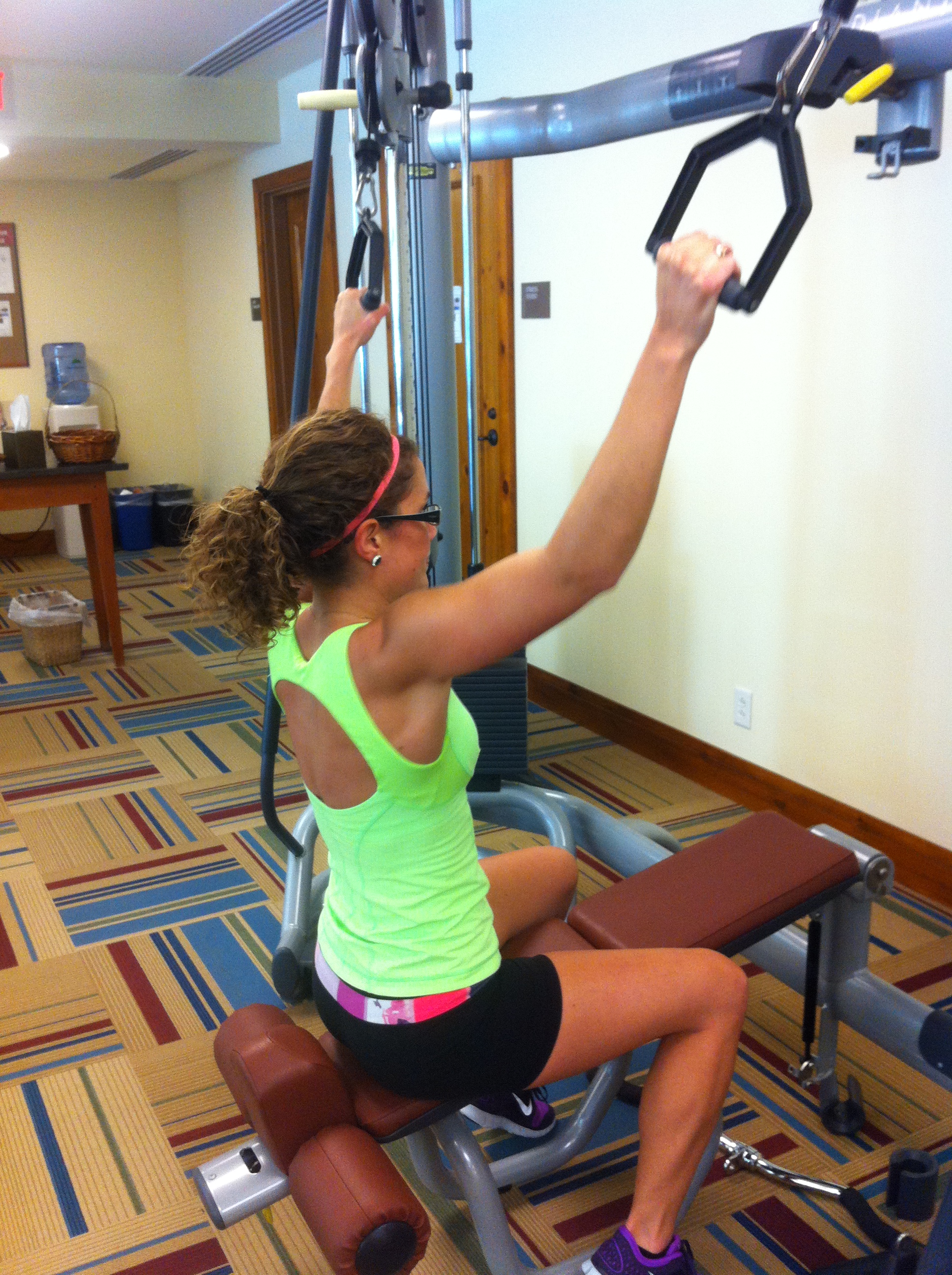 The nice thing about traveling with Tim, was I knew we would be working out most, if not all, of the days. Tim has been to a few of my classes, but this time I asked HIM to run me through a workout. I’ve mentioned before how I am trying to gain strength, so I was looking forward to workouts that were focused on just a few muscle groups vs a workout with multiple combination moves. On Wednesday, we skipped out on the ice cream social in favor of the gym- talk about serious self control! Anyway, we worked back and biceps first, followed by abs (which Tim let me lead) and then a really awesome trail run around the property. It was one of the better workouts I’ve had in a while- thanks, Tim! 🙂